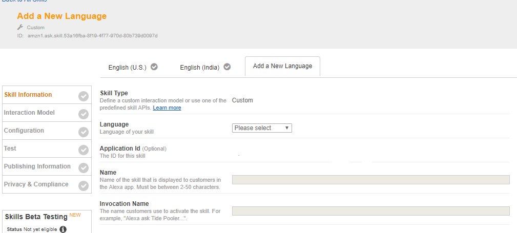 4. Click on “Add a new language” .(Here the skill already has two language models for English(U.S.) and English(India) .)