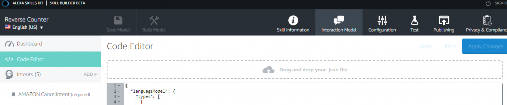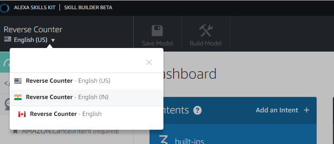 a. In Interaction model Switch to the US version by clicking on the language dropdown in the skill builder, and choose English (US).