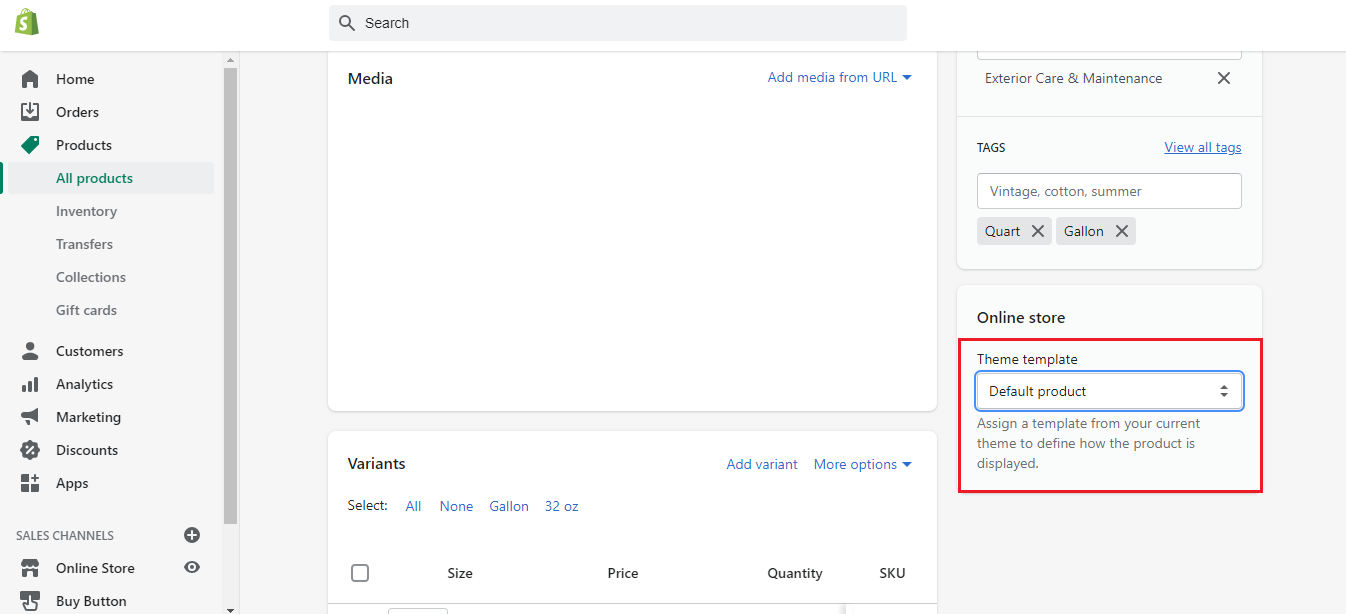 When we create a product, we need to give the theme template. Here we are using Default Template which is provided by the Shopify.