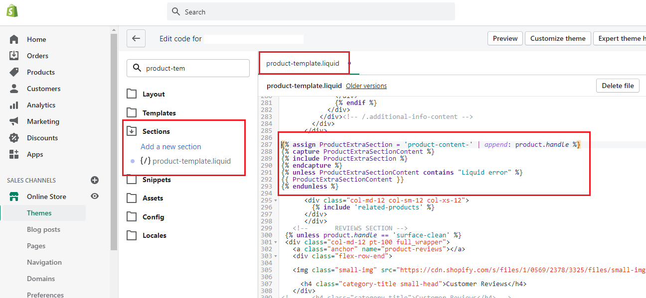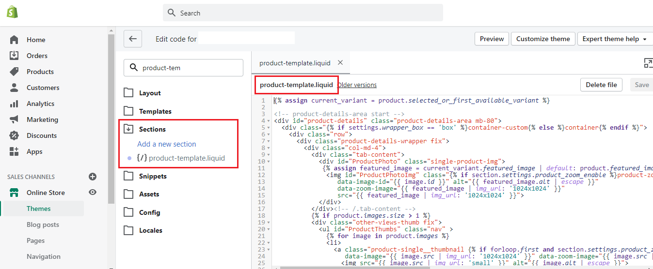 Product Template which is included in the product.liquid file, will be present in the Sections folder. It contains the code for the product image, description, add to cart button and also have snippets for "Related Products" and "Customer Reviews".