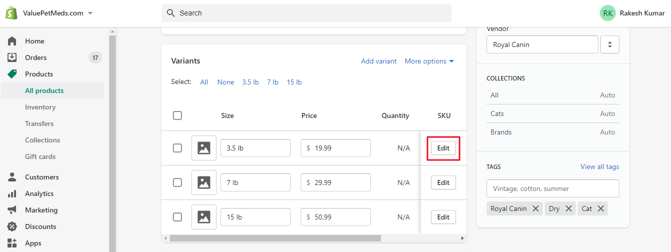 3. In the Variants section of the product detail page, click “Edit” beside the product variant.