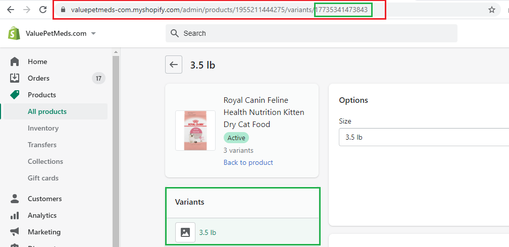 The number after /variants/ is the variant ID number. In this example, the variant ID is 17735341473843