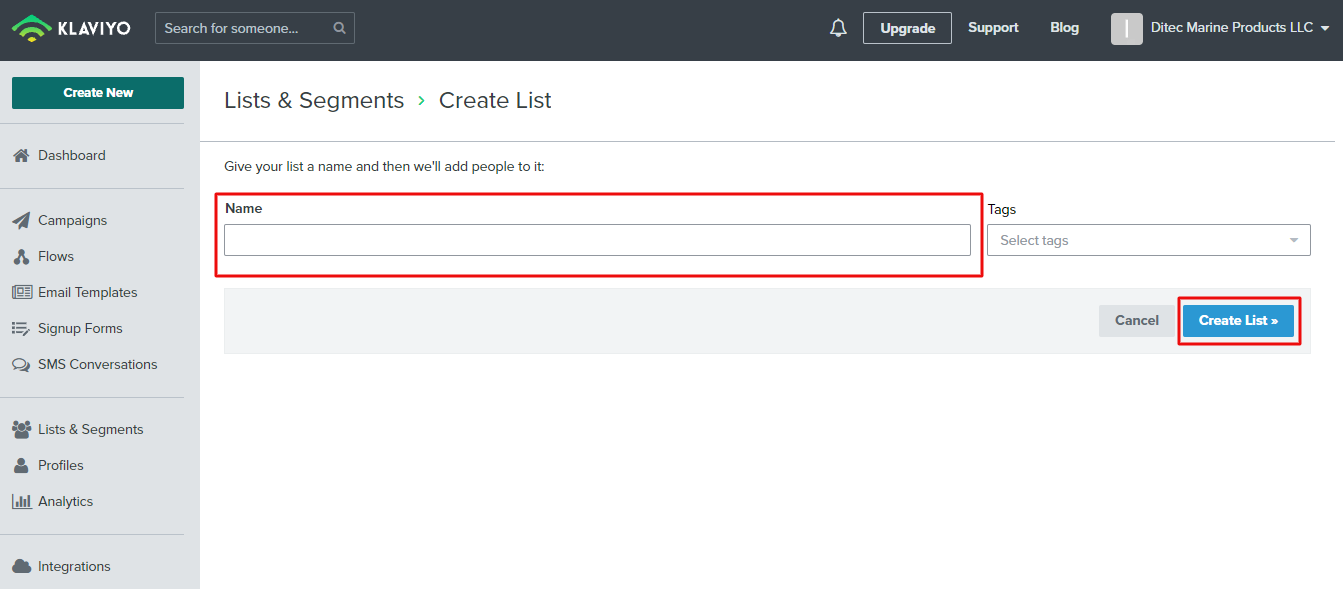 The first step is to create a list in Klaviyo. From the Klaviyo dashboard, go to Lists & Segments and click on create a list.