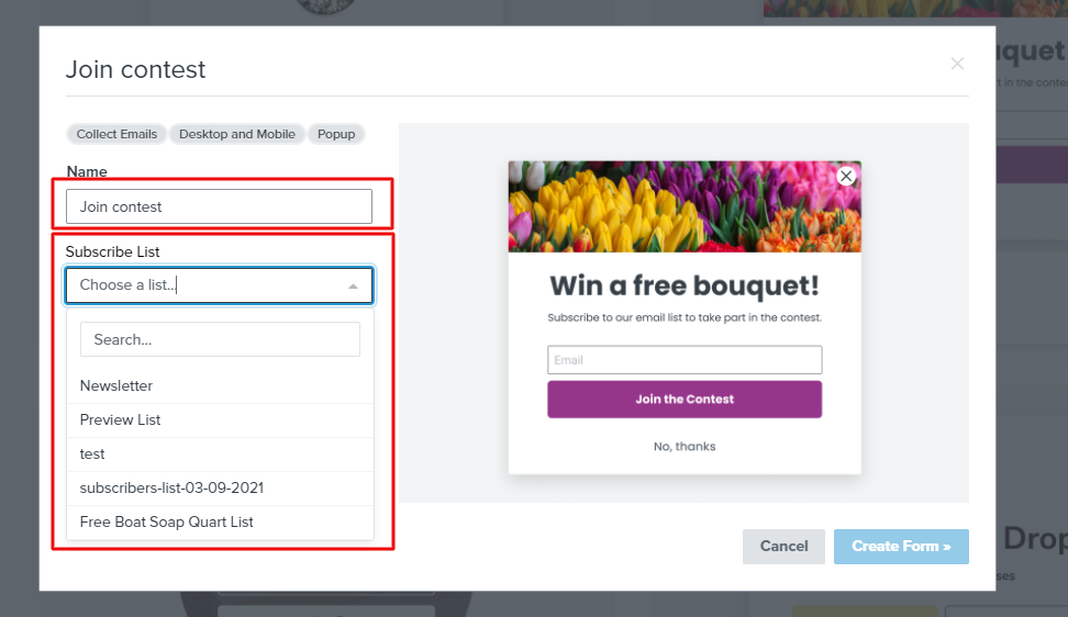 After selecting the sign-up form, we should give "Name" and "Subscriber List". Select the list which we have created earlier in the Step 1.