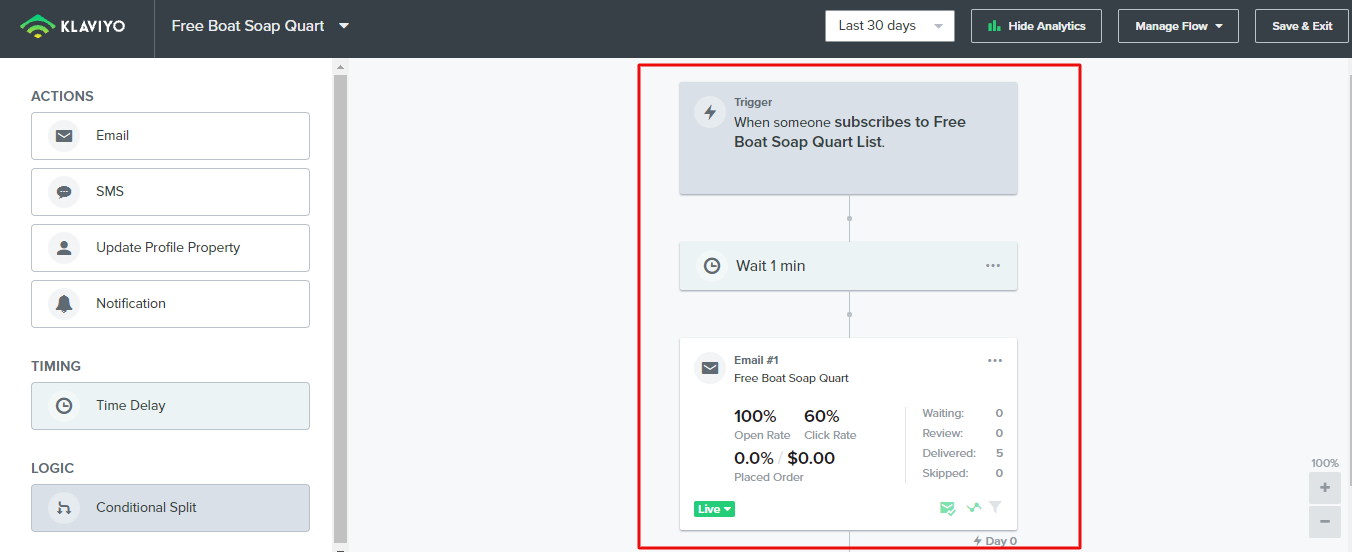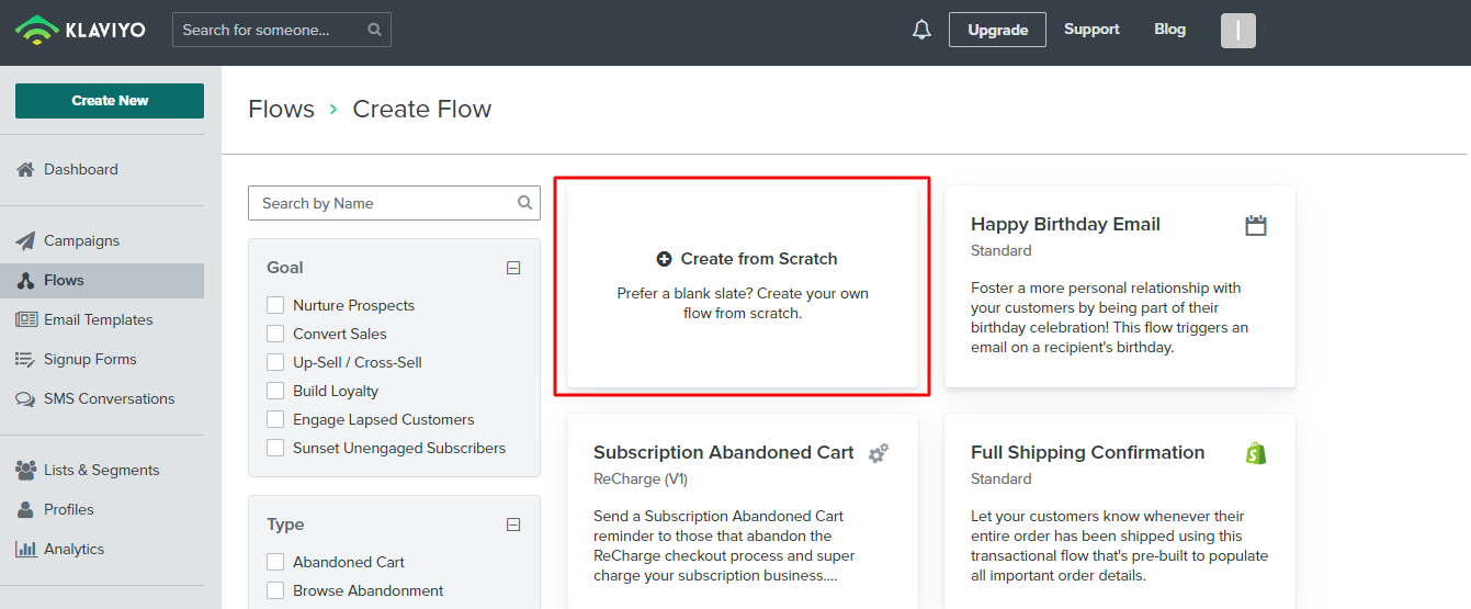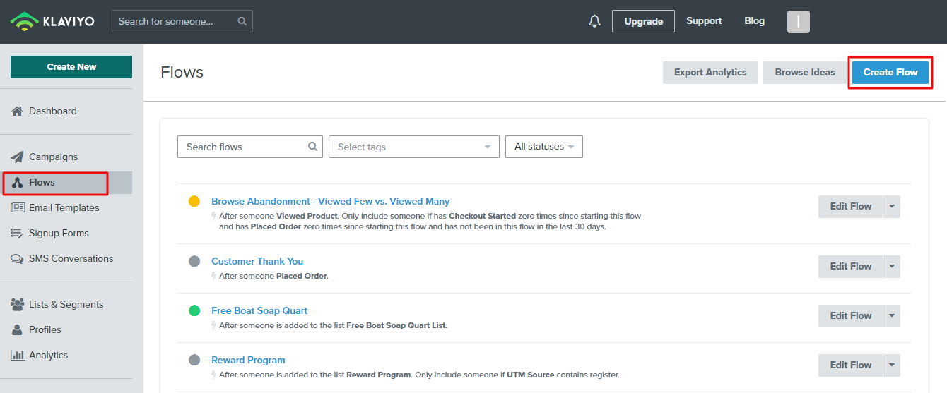 Now we need to create a "Flow" in Klaviyo. Go to "Flows" from Klaviyo dashboard and click on "Create Flow" button.