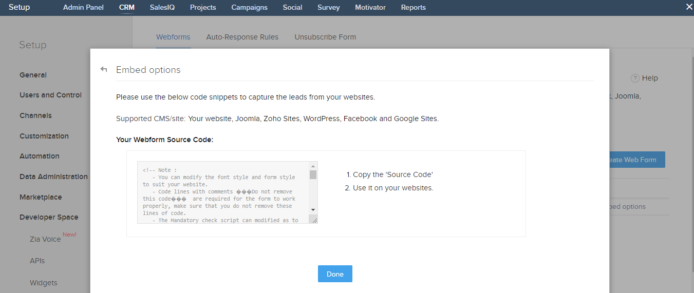 3. Get embedded code of the form while clicking on next step ,give your details and save you will get the code to copy ,you can add where ever you want in your website.