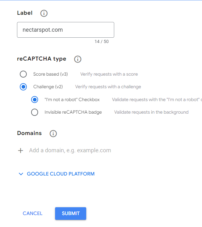 Add the domain name, reCAPTCHA Type and Submit to create a reCAPTCHA.