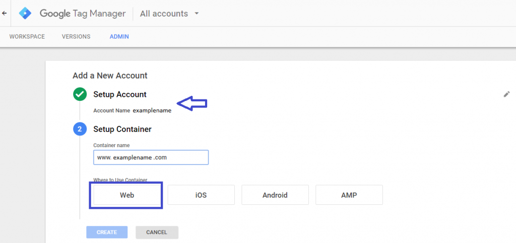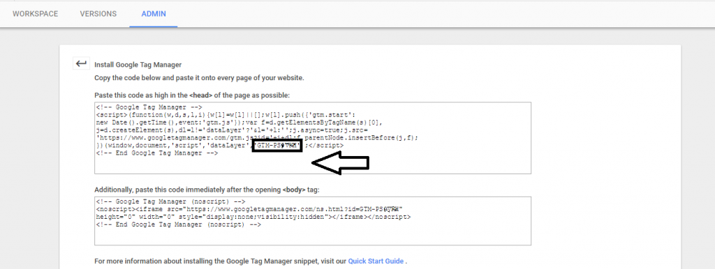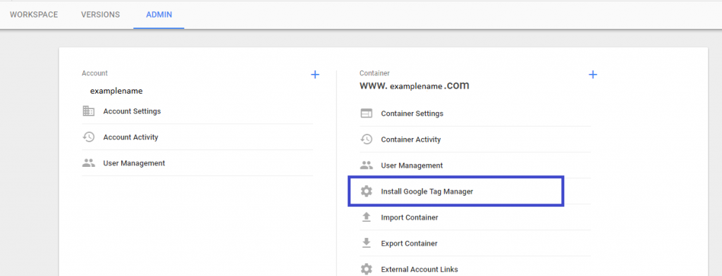 Now your container is set up, open it and go to Admin.Now Click on the gear symbol next to “Install Google Tag Manager”.